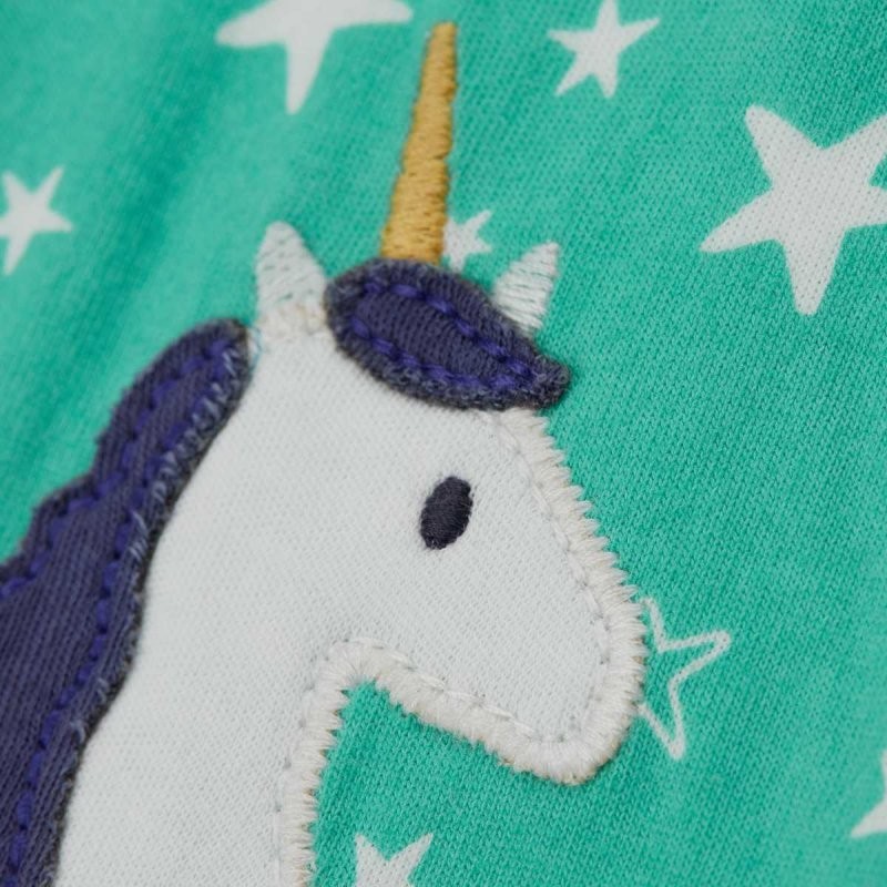 Ob mit Weste darüber oder mit langem Basic-Shirt darunter ist diese Kleidchen immer praktisch und deckt auch im Sommer alles wunderbar ab, damit die Allerkleinsten sich pudelwohl fühlen. Die traumhaft minte Farbe mit der tollen Applilaktion ist der absolute Hingucker.